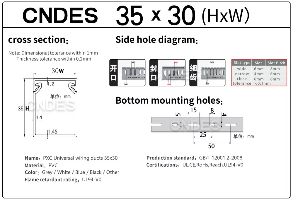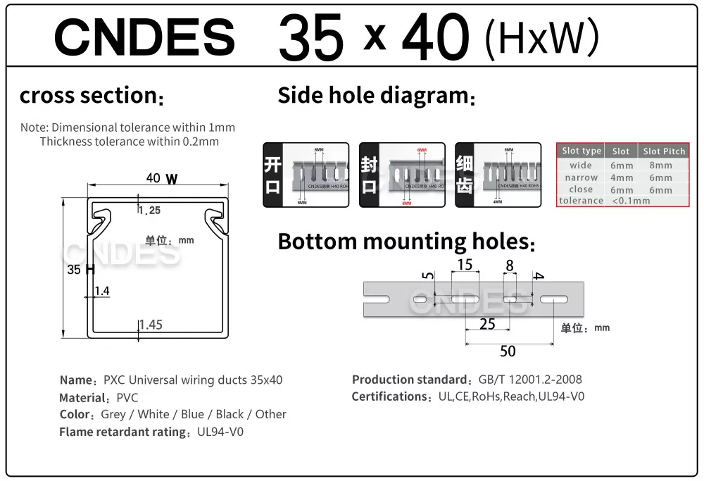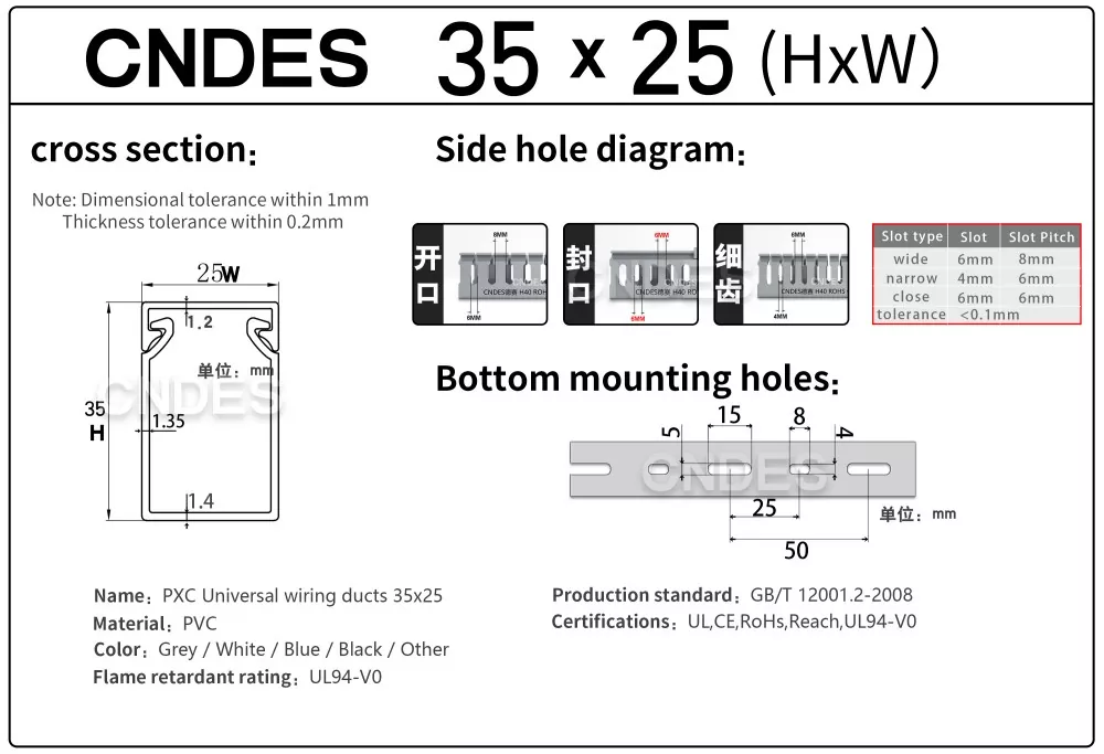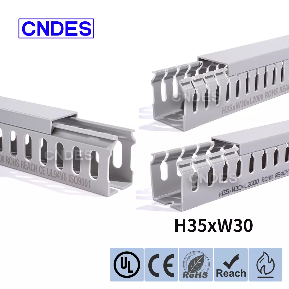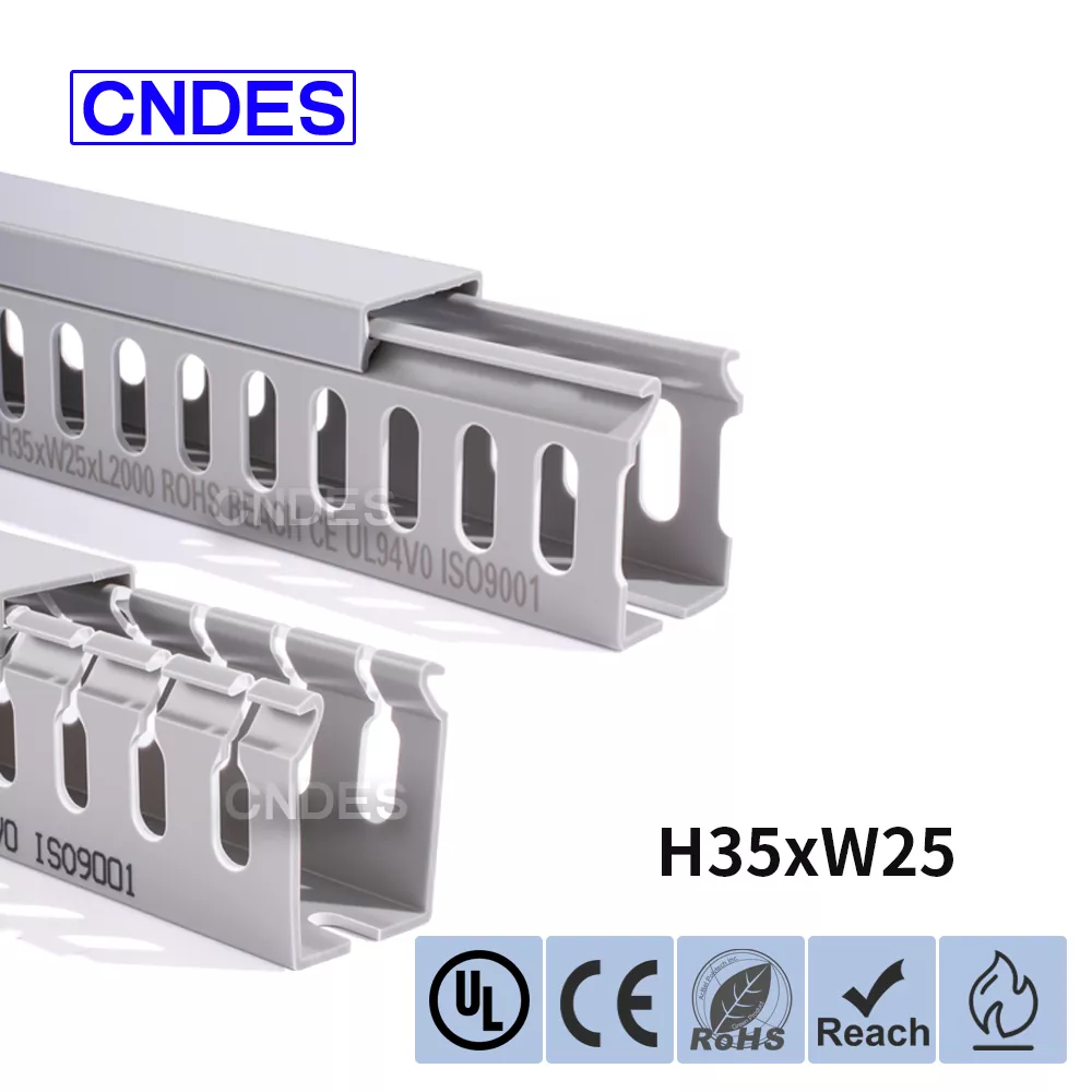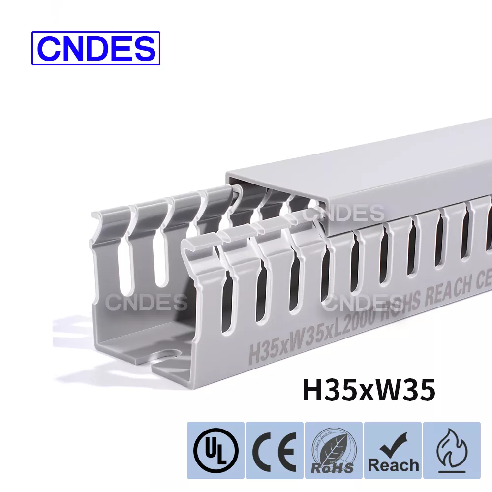 Hiina ettevõtte CNDES toodetud kohandatud 35 mm kõrguse piluga PVC traadi suunamiskanal koosneb jäigast PVC-alusest ja eemaldatavast kattest. Alusel on mõlemale küljele pressitud sõrmetaolised sooned, mis moodustavad "kammihambad". Neid hambaid saab käsitsi murda, võimaldades traadil horisontaalselt väljuda mis tahes asendist. Kate klõpsab kergesti oma kohale tagasi, säilitades kena välimuse. Kinnitusavade rida põhjas vastab DIN 43659 standardile. Seda saab M5 kruvide või neetide abil kiiresti kinnitada paneelide, kapiraamide või sarnaste konstruktsioonide külge.