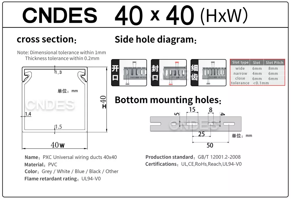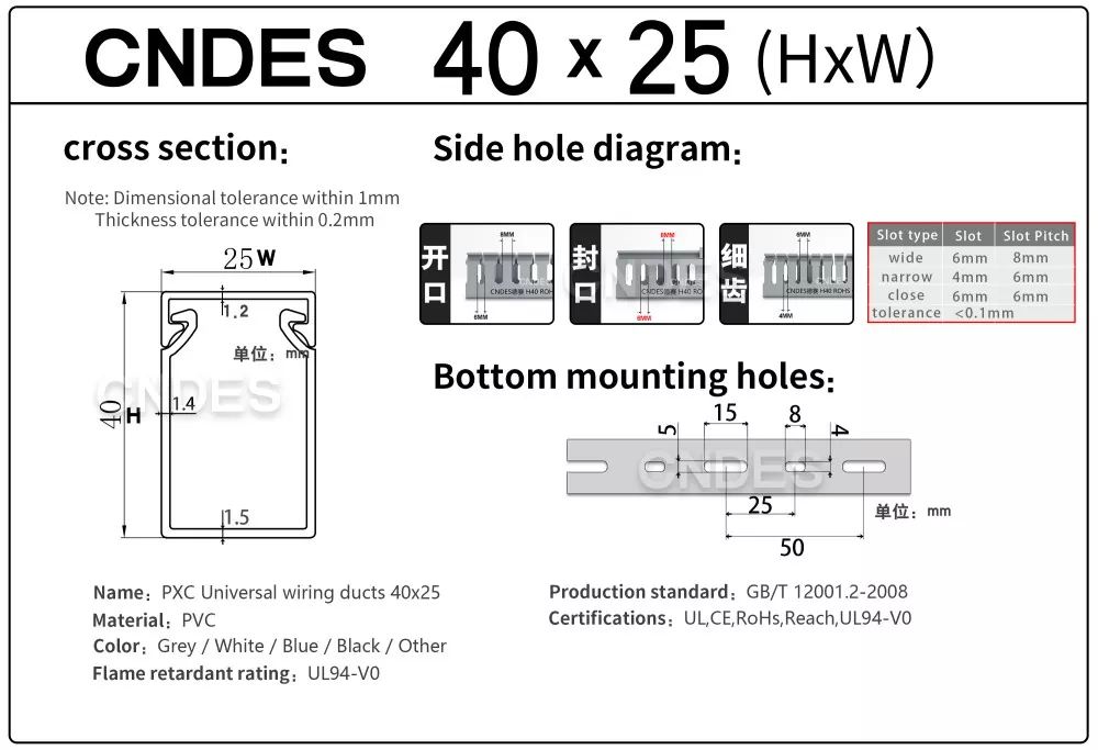 CNDES on juhtiv PVC piludega juhtmestiku võidusõidukanalite tootjad ja tarnijad. Siin tutvustame meie 40 mm kõrguseid kaablialuseid, sealhulgas 40*25, 40*30, 40*35, 40*40 ja 40*60.