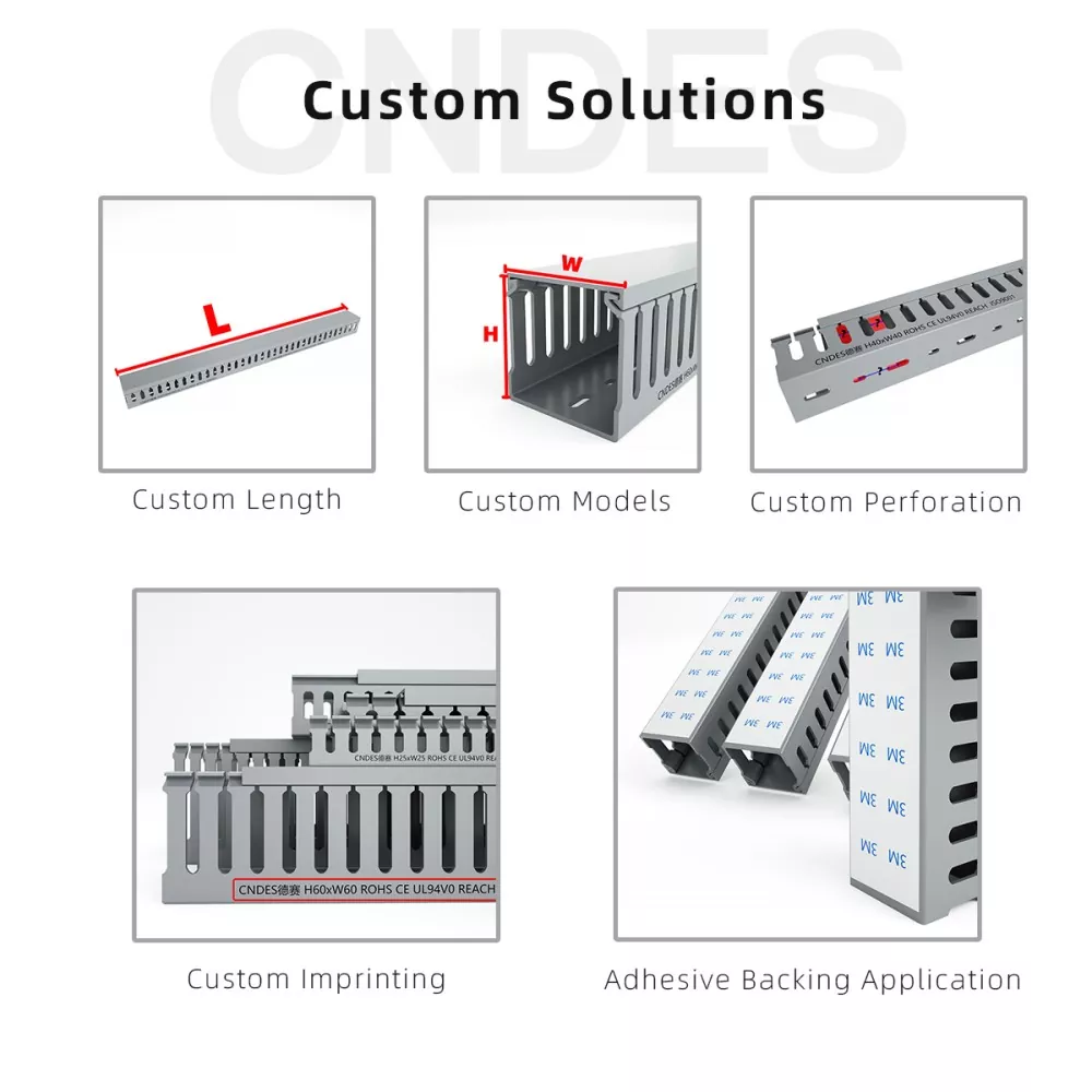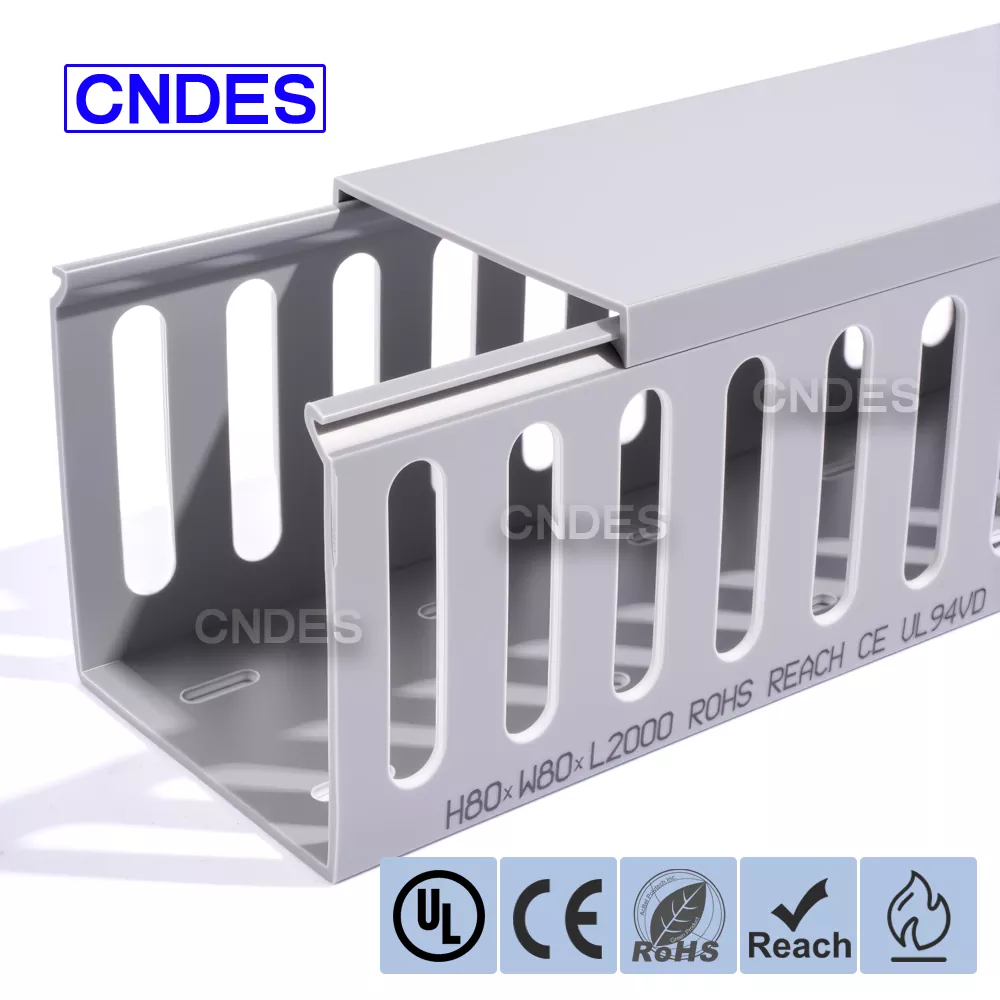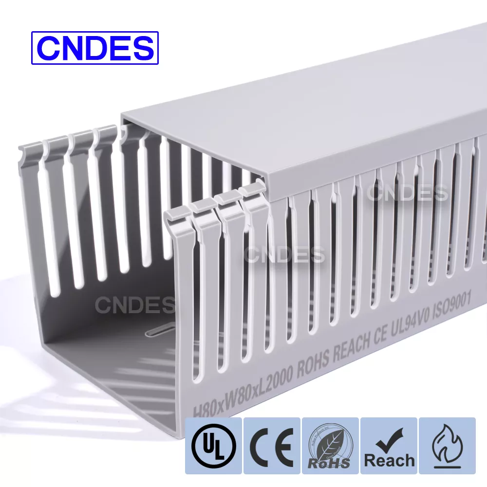 Kui standardsed kaablirennid ei mahuta keerulisi juhtmestikke, on CNDES kohandatud 80 × 80 piludega PVC jaotuskilbi juhtmestik teie hea valik. Suure siseruumiga 80 mm*80 mm on see spetsiaalselt loodud suure nõudlusega stsenaariumide jaoks, nagu andmekeskuse magistraalkaabeldus, tööstusseadmete toiteklastrid ja tsentraliseeritud juhtmestik suurtes juhtkappides. See mahutab ja korraldab hõlpsalt suure hulga kaableid, jättes korraks hüvasti segaduse ja ummikutega.