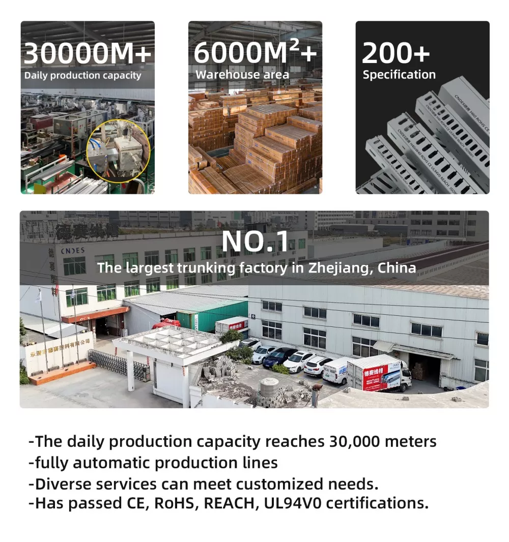 CNDES kui Hiinas asuva musta piluga PVC juhtmekanalite professionaalne uurimis- ja arendus- ning tootmistehas on spetsialiseerunud masstootmisele, rangele ISO kvaliteedikontrollile ja OEM/ODM-teenusele. Musti korpust kasutatakse tavaliselt stsenaariumides, mis nõuavad varjatud juhtmestikku (nt kodukino või kontorid) või erinevate funktsionaalsete vooluahelate (nt pinge- ja madalpingejuhtimine) eristamiseks.
