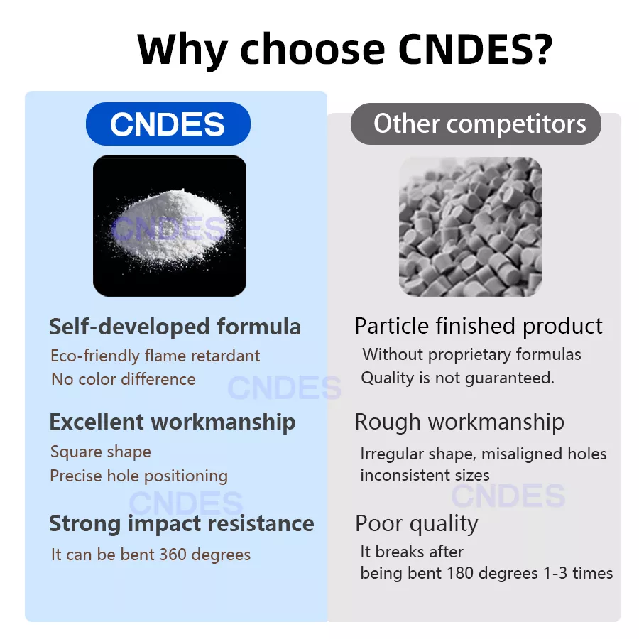 Meie valem on keskkonnasõbralik ja tulekindel. See tagab erinevate partiide värvimuutuste puudumise ja säilitab meie juhtmekanalites tugevad füüsikalised omadused, võimaldades neil vastu pidada korduvale 180° painutamisele ilma purunemata.
